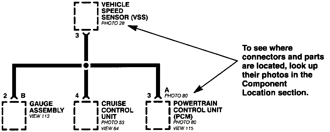 To see where a component or connector is located on the car, look up its photo number in the Component Location section in the back of the book. The photo will also tell you the color of the connector, and how many cavities it has.