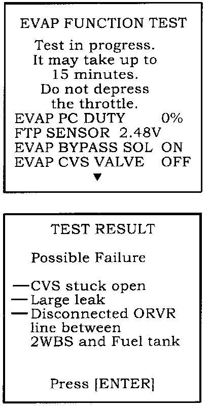 7. From the EVAP TEST screen, select 3: FUNCTION TEST. It may take as long as 15 minutes for the function test to complete. (A small spinning triangle at the bottom of the PGM Tester screen tells you the test is still running.) When the test is done, the PGM Tester shows if the EVAP system is working OK or if a problem was found. If a problem was found, the PGM Tester shows which components should be inspected.