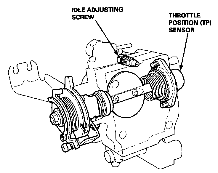DescriptionThe throttle body is a single-barrel side-draft type. The lower portion of the throttle valve is heated by engine coolant from the cylinder head. The idle adjusting screw, which increases/decreases bypass air, and the Evaporative Emission (EVAP) Control Canister port are located on the top of the throttle body.