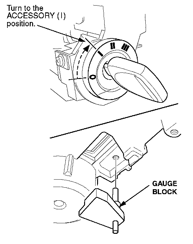 7. Insert the key into the ignition switch, turn the switch to the ACCESSORY (I) position, and install the gauge block.
