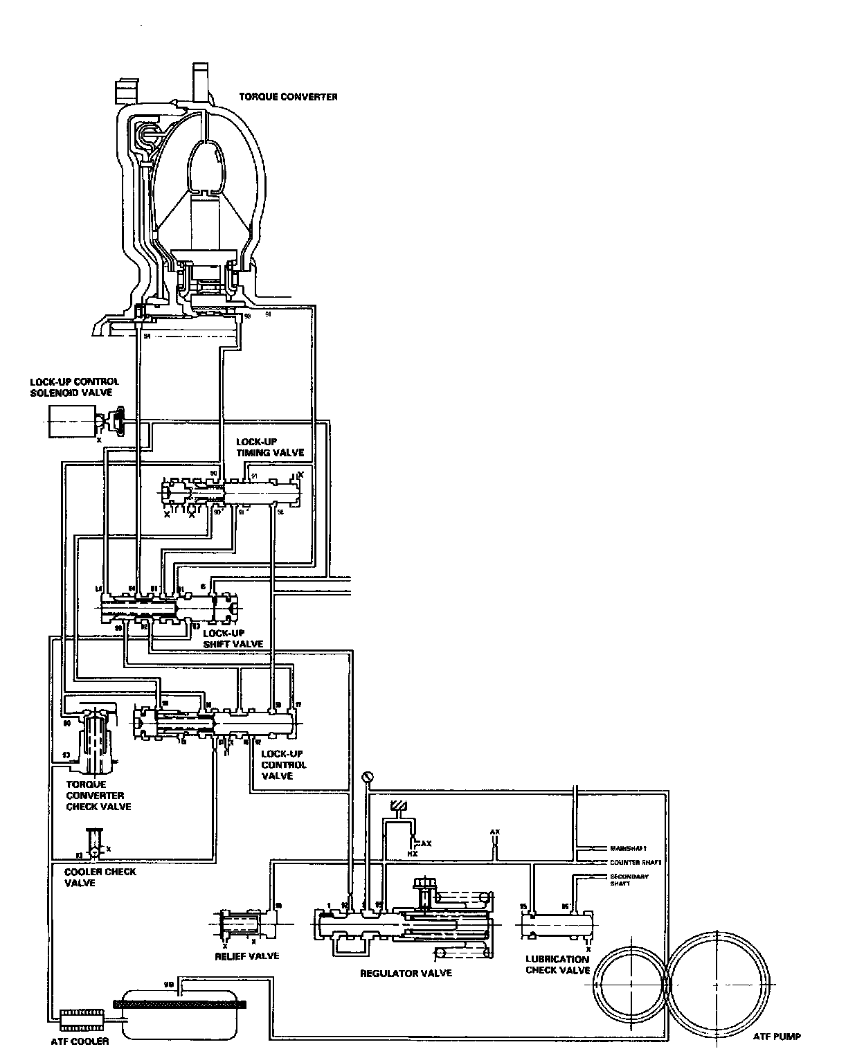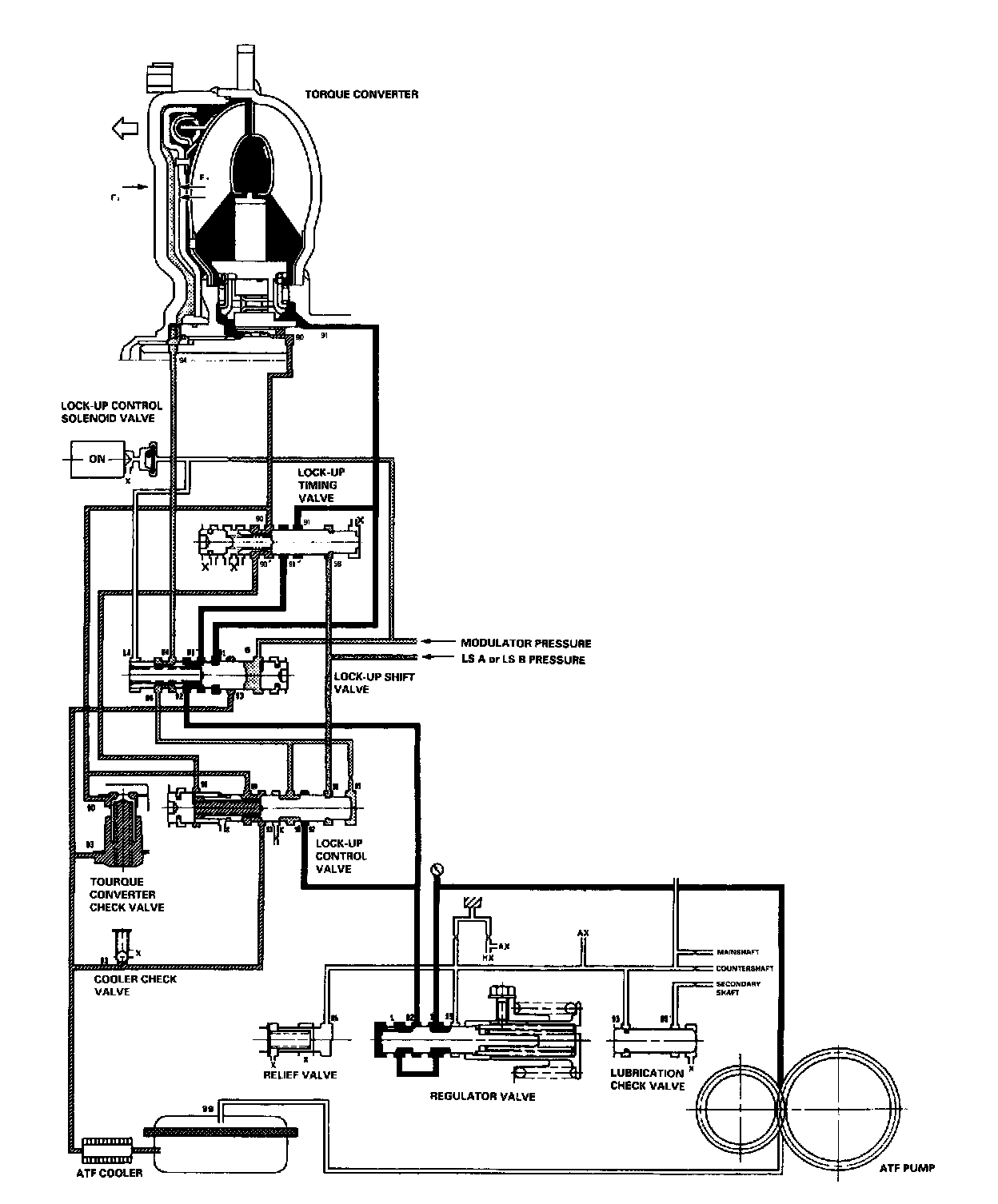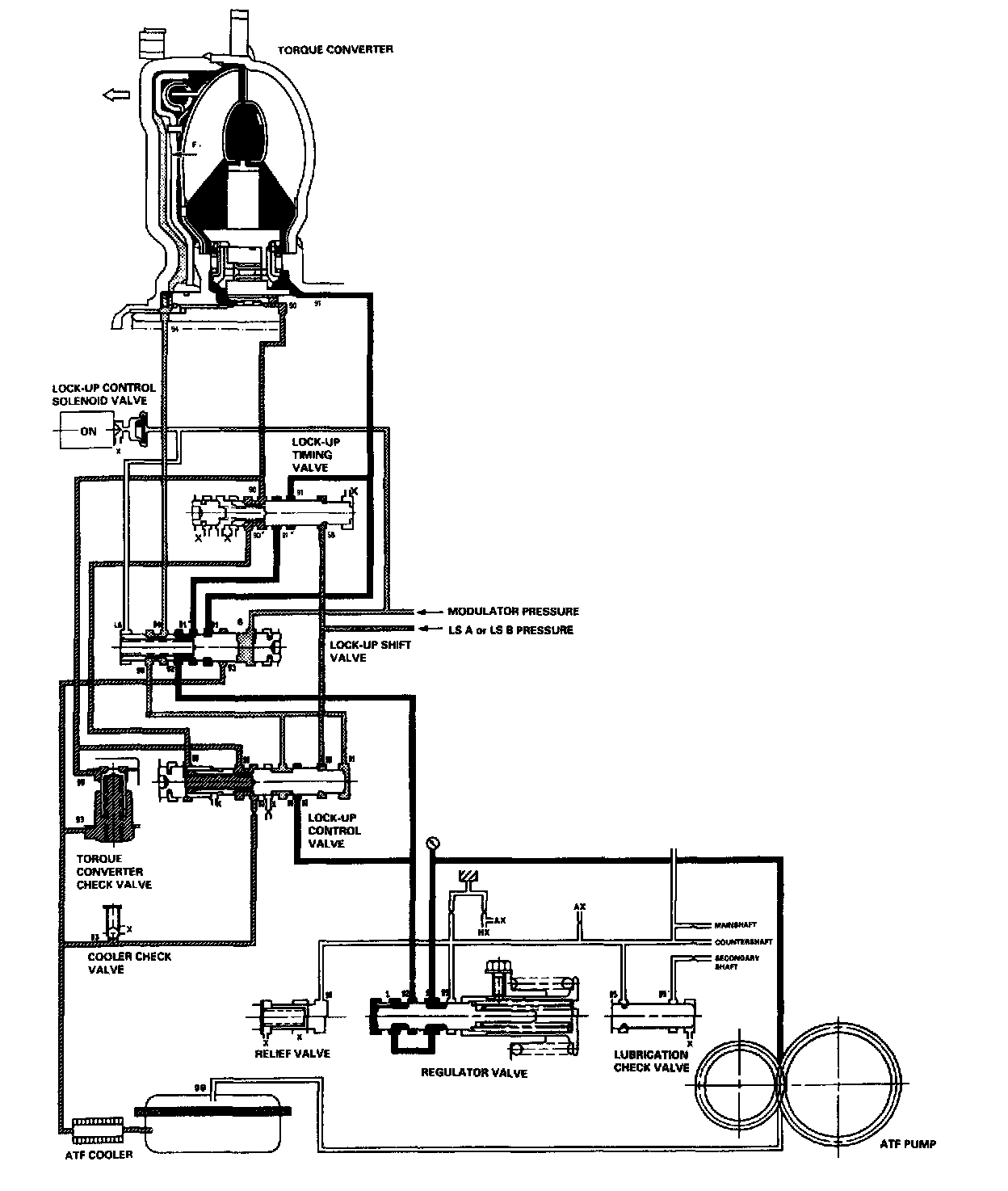 As the speed of the vehicle reaches the prescribed value, the lock-up control solenoid valve is turned ON by the Transmission Control Module (TCM) or Powertrain Control Module (PCM) to release LC pressure (LA) in the left side of the lock-up shift valve. The lock-up shift valve is moved to the left side to switch the port leading torque converter pressure to the left side and right side of the torque converter. Torque converter pressure (92) flows to the right side of the torque converter to engage the lock-up clutch. The PCM also controls Automatic Transaxle (A/T) Clutch Pressure Control (CPC) solenoid valves A and B, and LS A or LS B pressure is applied to the lock-up control valve and the lock-up timing valve. The position of the lock-up control valve depends on torque converter pressure and LS A or LS B pressure. When LS A or LS B pressure (58) is lower, torque converter pressure (92) from the regulator valve passes through the lock-up control valve, and flows to the left side of the torque converter to disengage the lock-up clutch. Under this condition, the torque converter receives pressure from the right side (to engage the lock-up clutch) and the left side (to disengage the lock-up clutch); the lockup clutch is in partial lock-up condition.