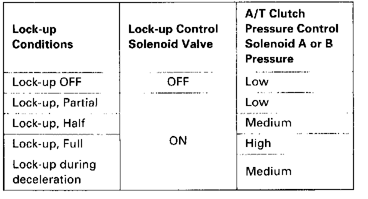 The table displayed shows the lock-up conditions for the lock-up control solenoid valve and the A/T CPC solenoid A or B pressure.