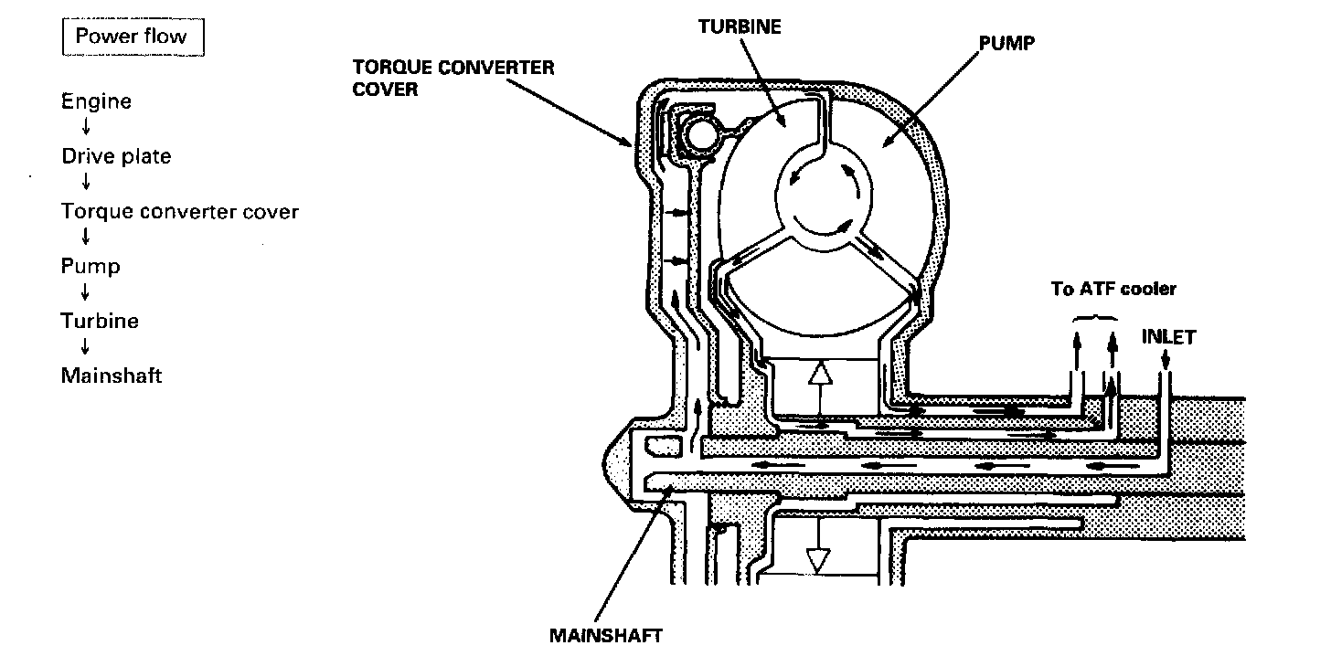 With the lock-up clutch on, fluid in the chamber between the torque converter cover and the lock-up piston is drained off, and the converter fluid exerts pressure through the piston against the torque converter cover. As a result, the converter turbine is locked to the converter cover. The effect is to bypass the converter, placing the vehicle in direct drive.