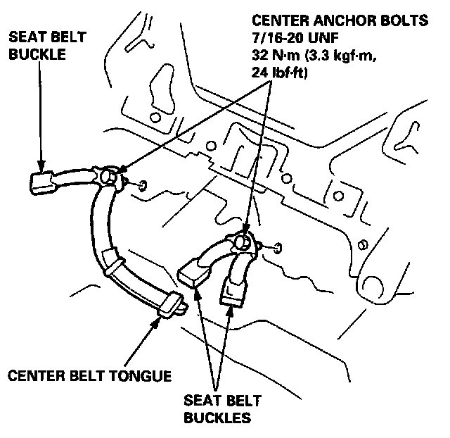2. Remove the center anchor bolts, then remove the seat belt buckles and center belt tongue.