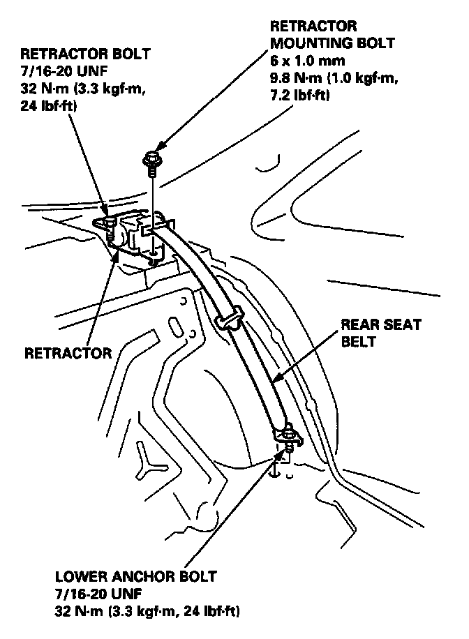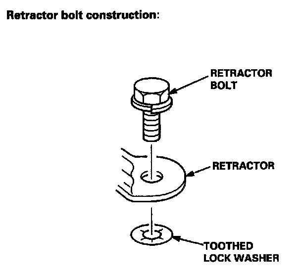 2. Remove the lower anchor bolt and retractor bolt, remove the retractor mounting bolt, then remove the rear seat belt and retractor.
