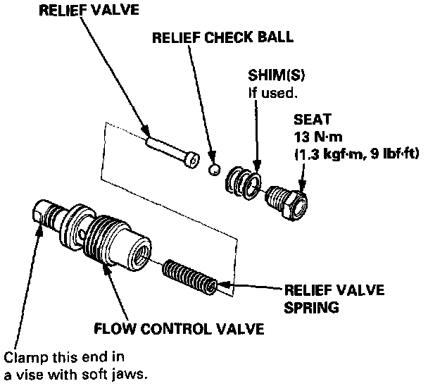 7. Unscrew the seat in the top end of the valve, and remove any shims, the relief check ball, relief valve and relief valve spring.