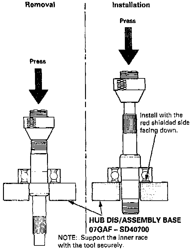 2. Remove and discard the ball bearing using the special tool and a press as shown.