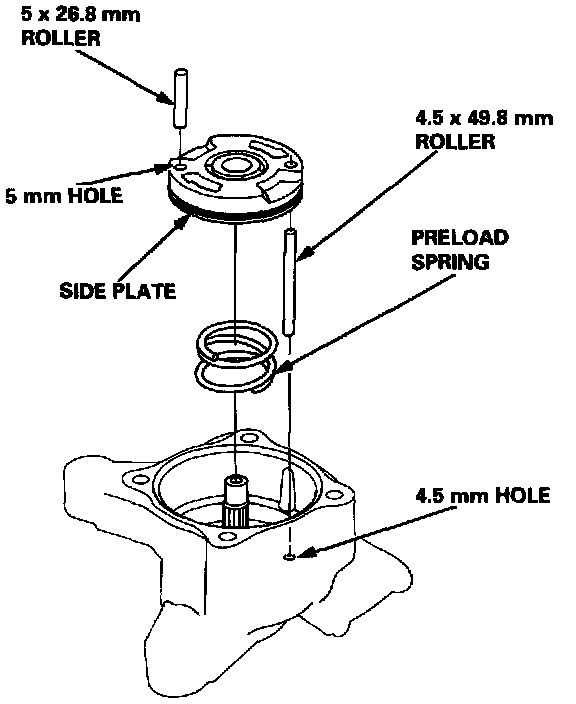 7. Set the 4.5 x 49.8 mm roller in the 4.5 mm hole in the pump housing.