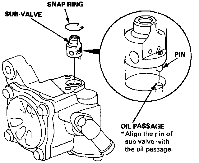 19. Align the pin of sub valve with the oil passage in pump housing, and push down the sub valve. Fix the sub valve with the snap ring.