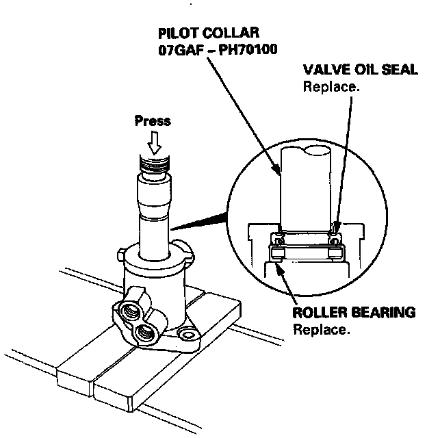 31. Press the valve oil seal and roller bearing out of the valve housing using a hydraulic press and special tool shown below.