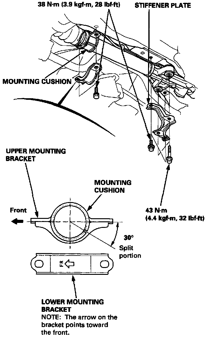 7. Install the right mounting bracket over the mounting cushion, then loosely install two gearbox mounting baits.
