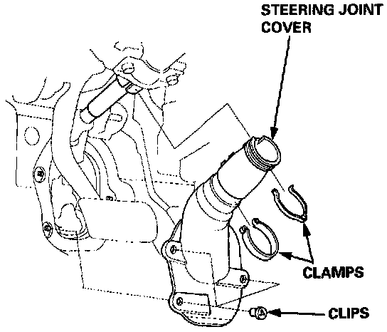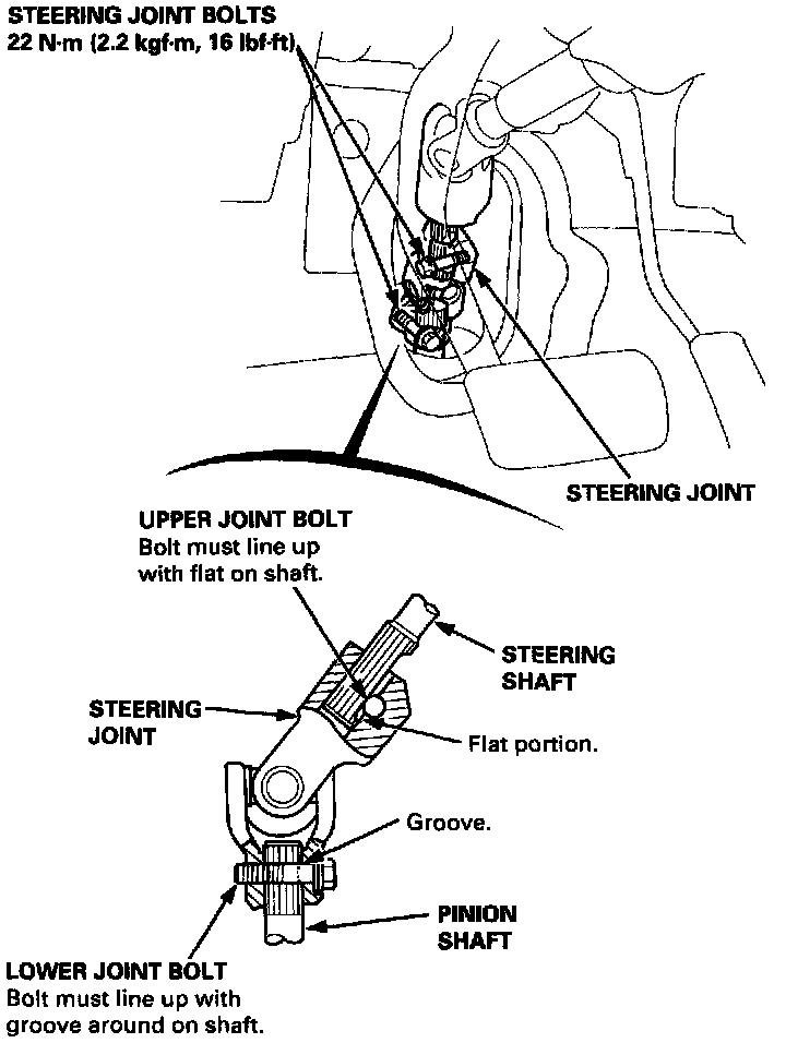b. Slip the lower end of the steering joint onto the pinion shaft (line up the bolt hole with the groove around the shaft), and loosely install the lower joint bolt. Be sure that the lower joint bolt is securely in the groove in the pinion shaft.