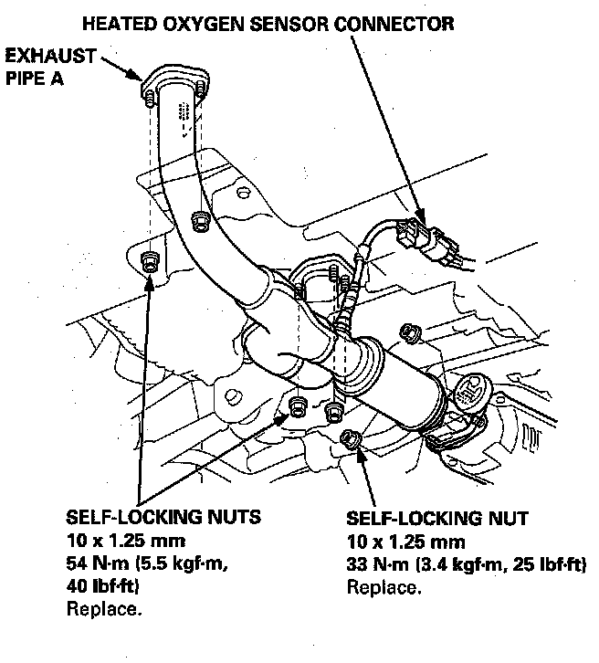 14. Install exhaust pipe A with the new gaskets and new self-locking nuts, and connect the heated oxygen sensor (H02S) connector.