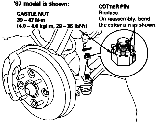 CAUTION: Torque the castle nut 1'97 model) to the lower torque specification, then tighten it only far enough to align the slot with the pin hole. Do not align the nut by loosening.