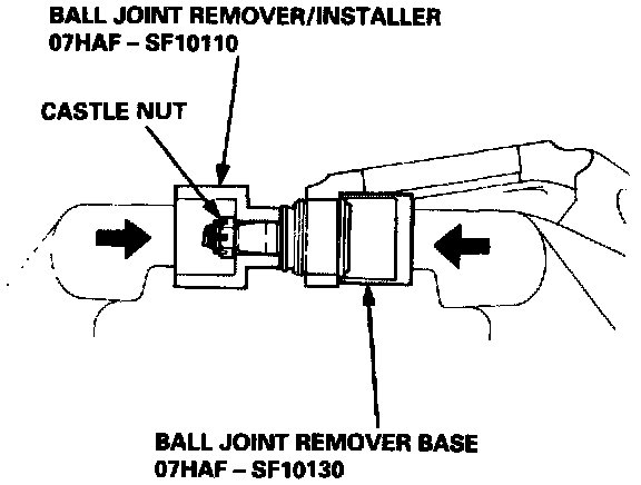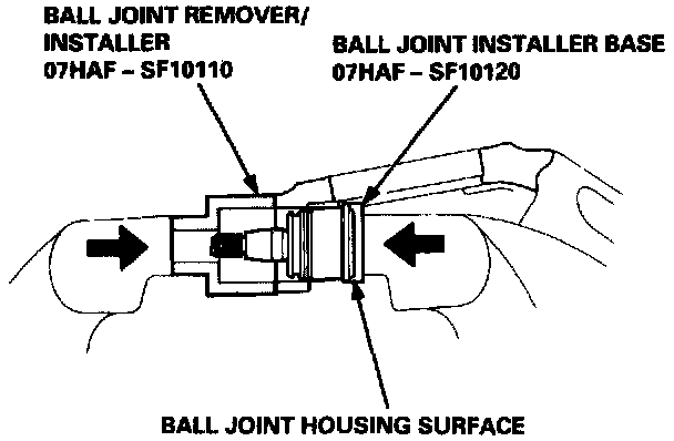 7. Install the special tools over the ball joint as shown, then press the ball joint in.