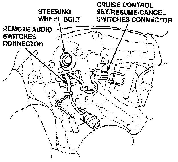 8. Unplug the connectors from the remote audio and cruise control set/resume/cancel switches, then remove the steering wheel bolt.