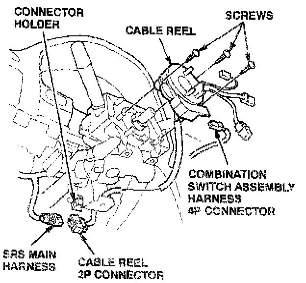11. Unplug the combination switch assembly harness 4P connector from the cable reel. Detach the cable reel 2P connector from its connector holder, and unplug the 2P connector from the SRS main harness.