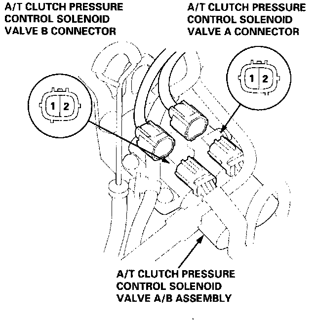 1. Disconnect the 2P connectors from the A/T clutch pressure control solenoid valve A and B.2. Measure the resistance of the A/T clutch pressure control solenoid valves A and B between the No. 1 and No. 2 terminals of each connector.