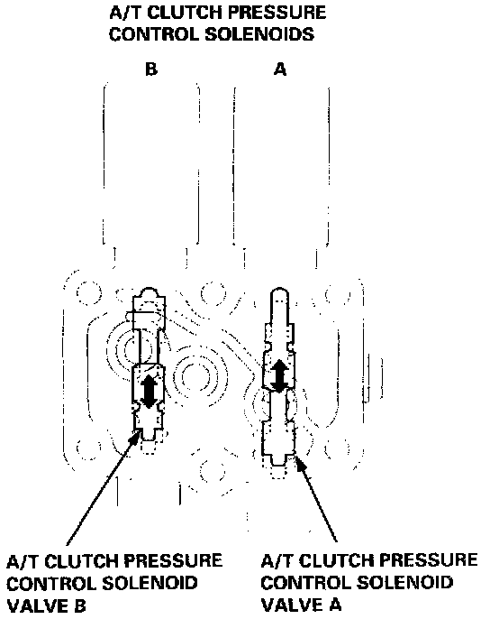 9. If either valve binds, or moves sluggishly, or if the A/T clutch pressure control solenoid does not operate, replace the A/T clutch pressure control solenoid valve A/B assembly.