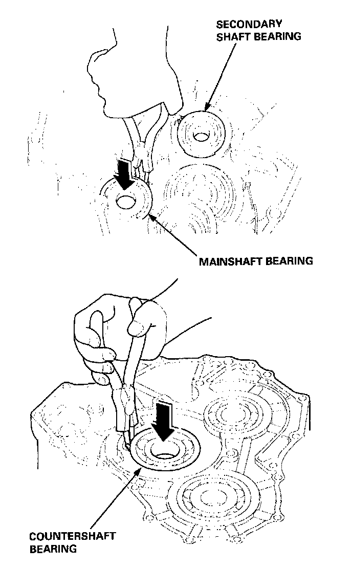 1. To remove the mainshaft, countershaft and secondary shaft bearings from the transmission housing, expand each snap ring with the snap ring pliers, then push the bearing out.