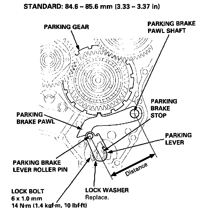 45. If the parking brake pawl does not engage fully, check the distance between the parking brake pawl shaft and the parking brake lever roller pin as described.