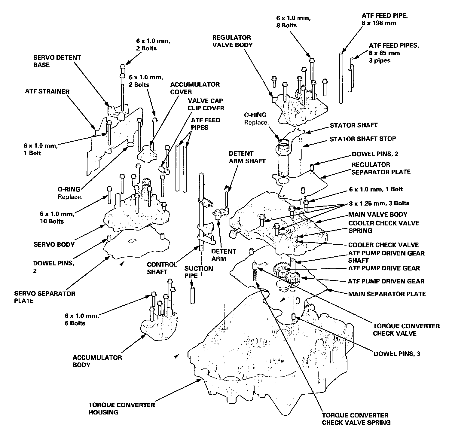 15. Install the two ATF feed pipes in the servo body, four pipes in the regulator valve body, and the suction pipe in the accumulator body.
