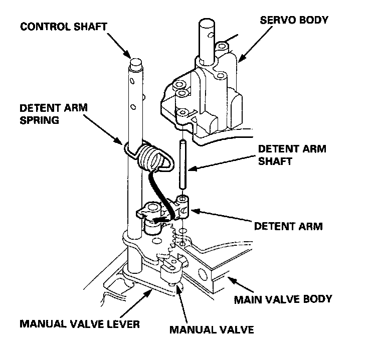 9. Install the detent arm and arm shaft in the main valve body, then hook the detent arm spring to the