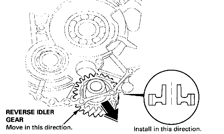 21. Install the reverse idler gear in the transmission housing as shown, then slide it in the direction shown.