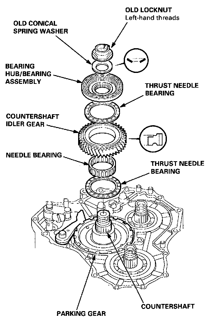 32. Install the thrust needle bearing, needle bearing, countershaft idler gear, thrust needle bearing, bearing hub/bearing assembly, and the old conical spring washer. Then tighten the old locknut to seat the bearing hub/bearing assembly to the specified torque.