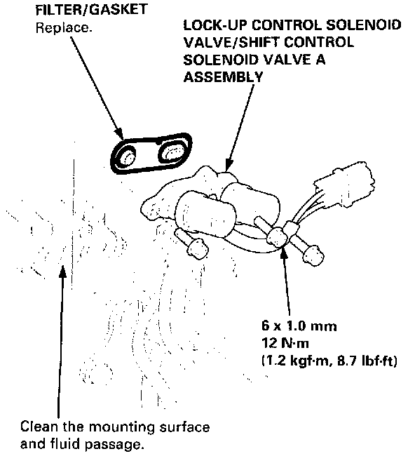 2. Clean the mounting surface and fluid passage of the lock-up control solenoid valve/shift control solenoid valve A assembly, and install a new lock-tip control solenoid valve/shift control solenoid valve A assembly with a new filter/gasket.
