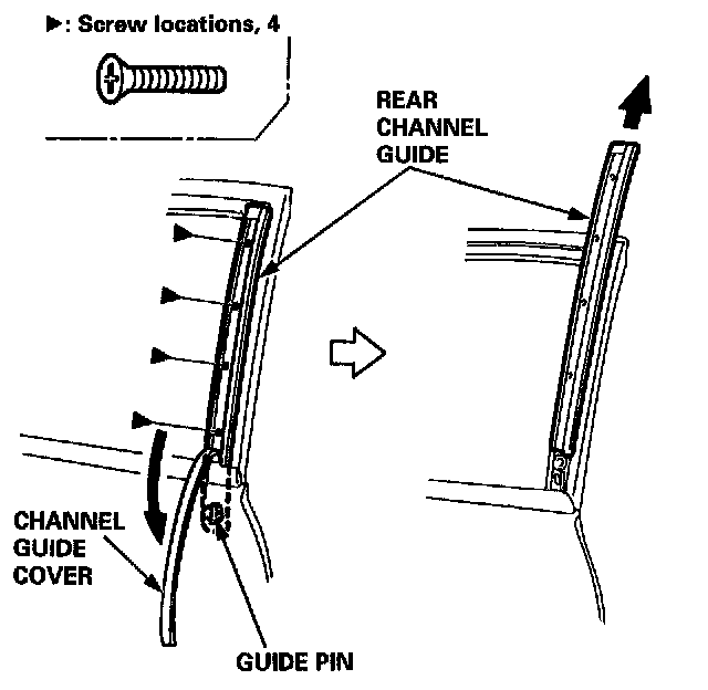 2. Lower the glass fully, then peel off the channel guide cover. Remove the screws, then remove the rear channel guide by pulling it upward.