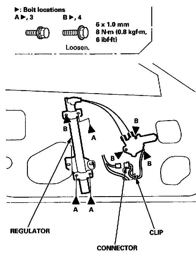 5. Disconnect the connector, then remove the regulator through the center hole in the door.