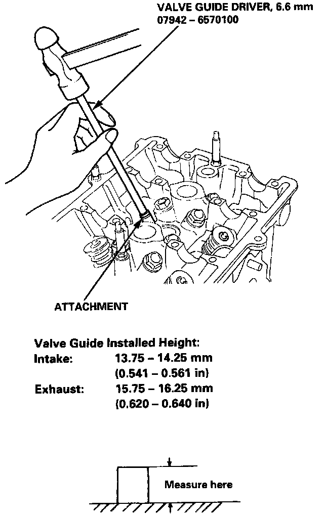 7. Apply a thin coat of clean engine oil to the outside of the new valve guide. Install the guide from the camshaft side of the head; use the special tool to drive the guide in to the specified installed height. If you have all 16 guides to do, you may have to reheat the head.
