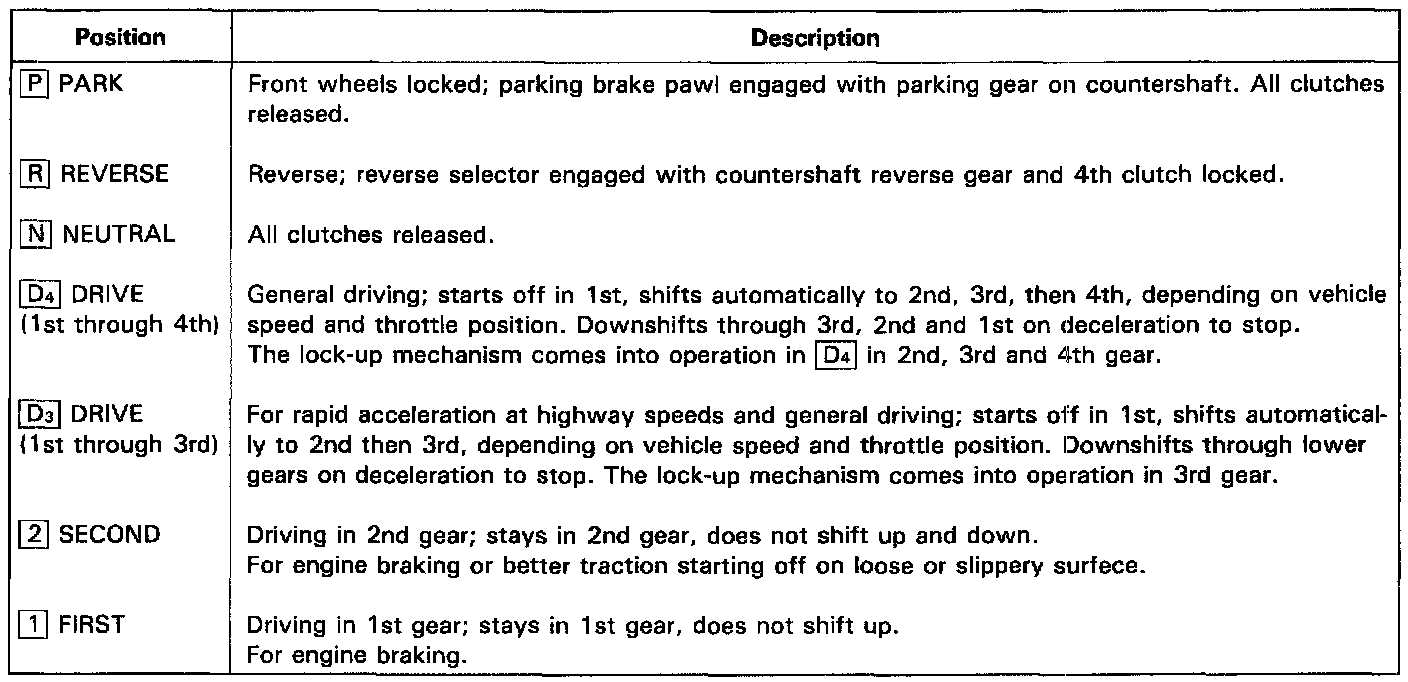 The shift lever has seven positions; [P] PARK, [R] REVERSE, [N] NEUTRAL, [D4] 1st through 4th ranges, [D3] 1st through 3rd ranges, [2] 2nd gear and [1] 1st gear.