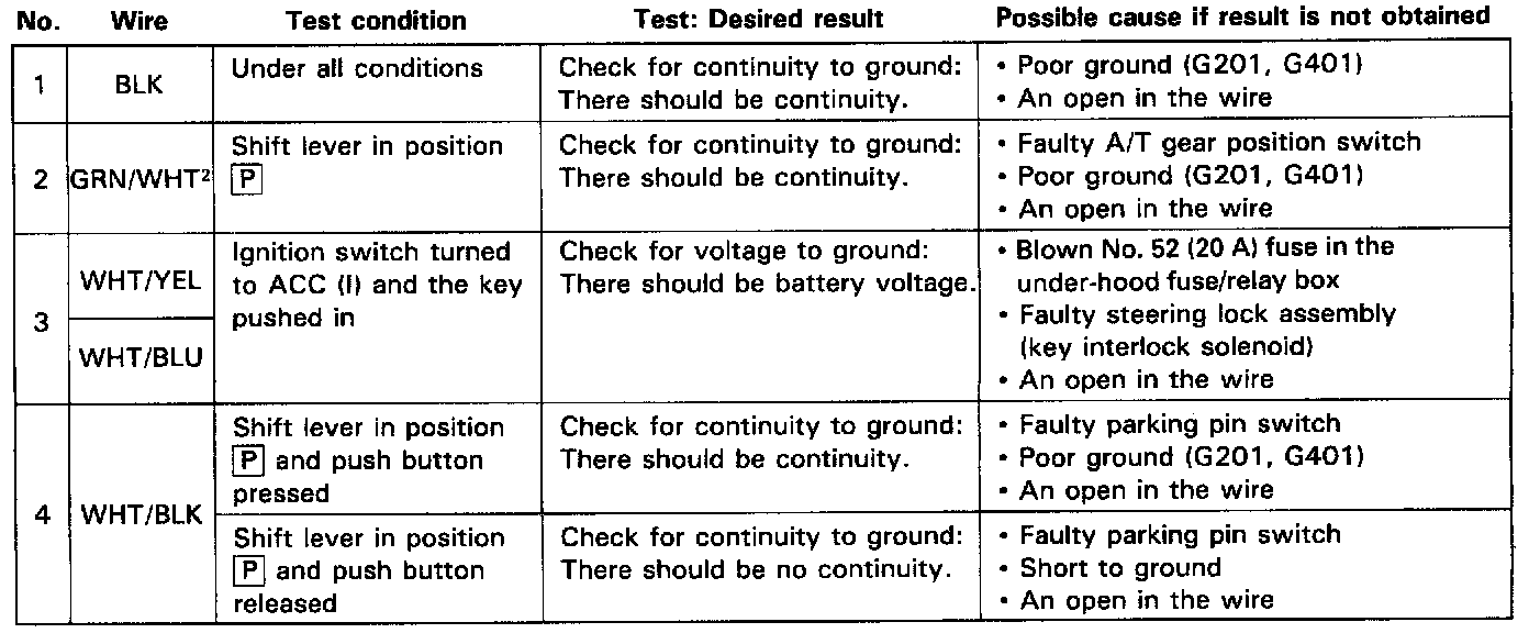 NOTE: If the shift lock solenoid clicks when the ignition switch is turned ON (II) and you step on the brake pedal (with the shift lever in [P], the shift lock system is electronically normal; if the shift lever cannot be shifted from [P], test the A/T gear position switch.