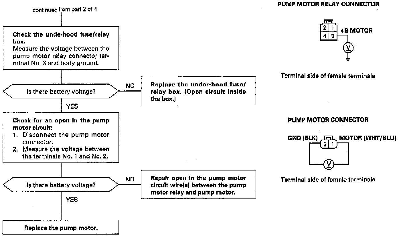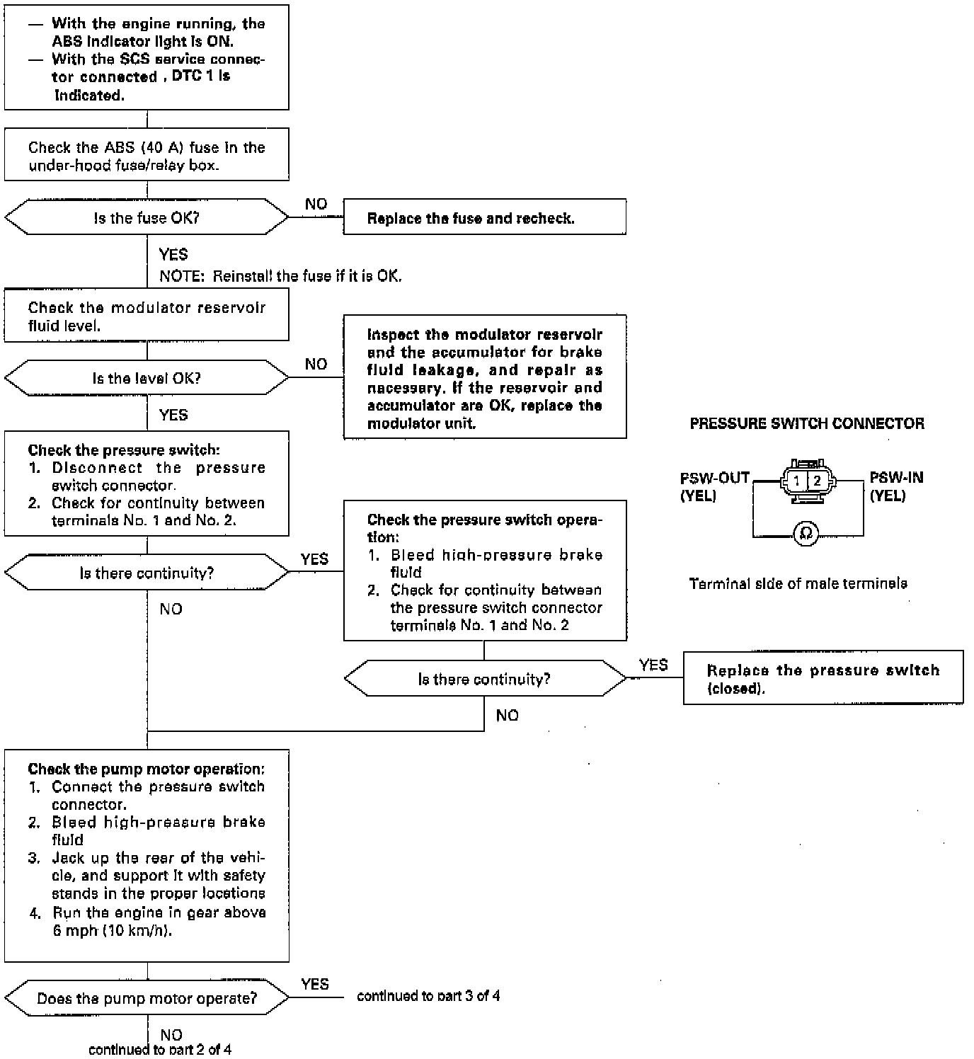 - Pump Motor Relay (PMR) circuit wire is shorted or the ABS control unit is internally shorted (the motor stops when the ignition switch is turned OFF).