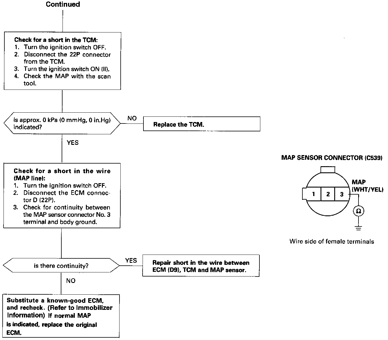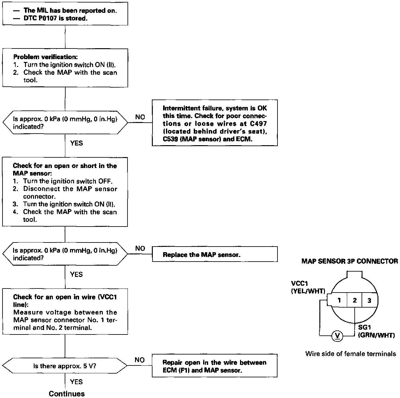 The scan tool indicates Diagnostic Trouble Code (DTC) P0107: A low voltage (high vacuum) problem in the Manifold Absolute Pressure (MAP) sensor.