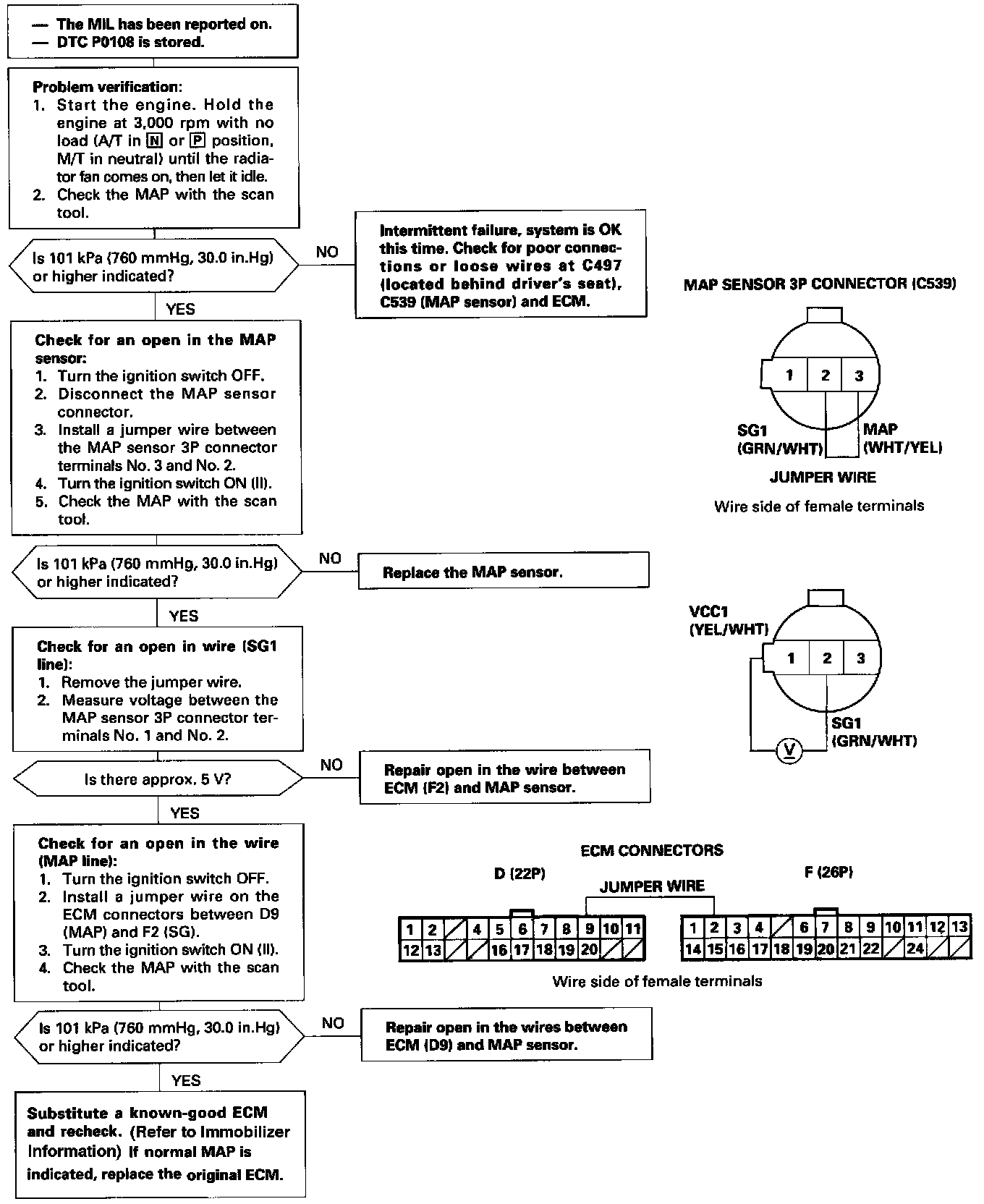 The scan tool indicates Diagnostic Trouble Code (DTC) P0108: A high voltage (low vacuum) problem in the Manifold Absolute Pressure (MAP) sensor.