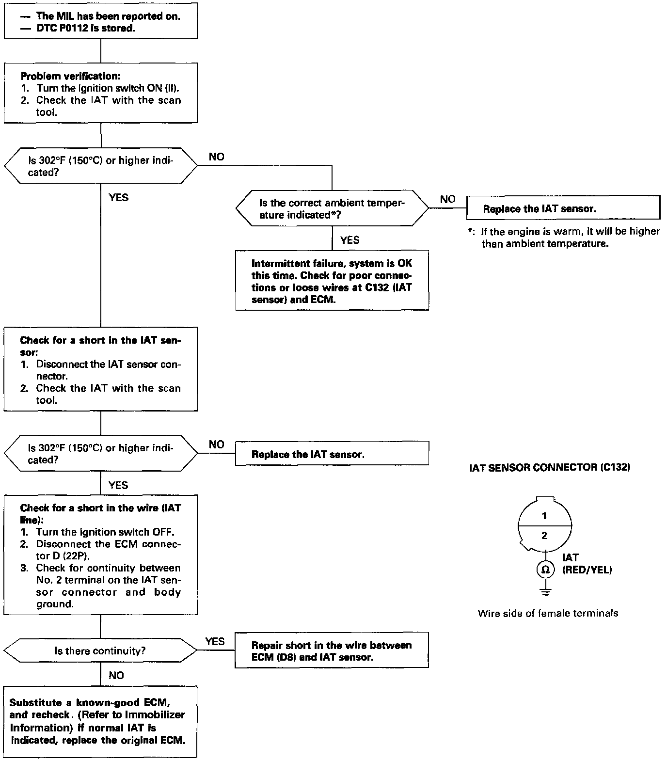 The scan tool indicates Diagnostic Trouble Code (DTC) P0112: A low voltage (high temperature) problem in the Intake Air Temperature (IAT) sensor circuit.