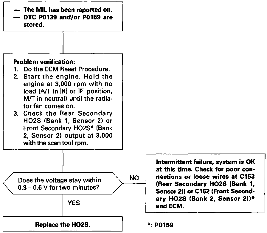 The scan tool indicates Diagnostic Trouble Code (DTC) P0159: A slow response problem in the Front Secondary Heated Oxygen Sensor (HO2S) (Bank 2, Sensor 2) circuit.