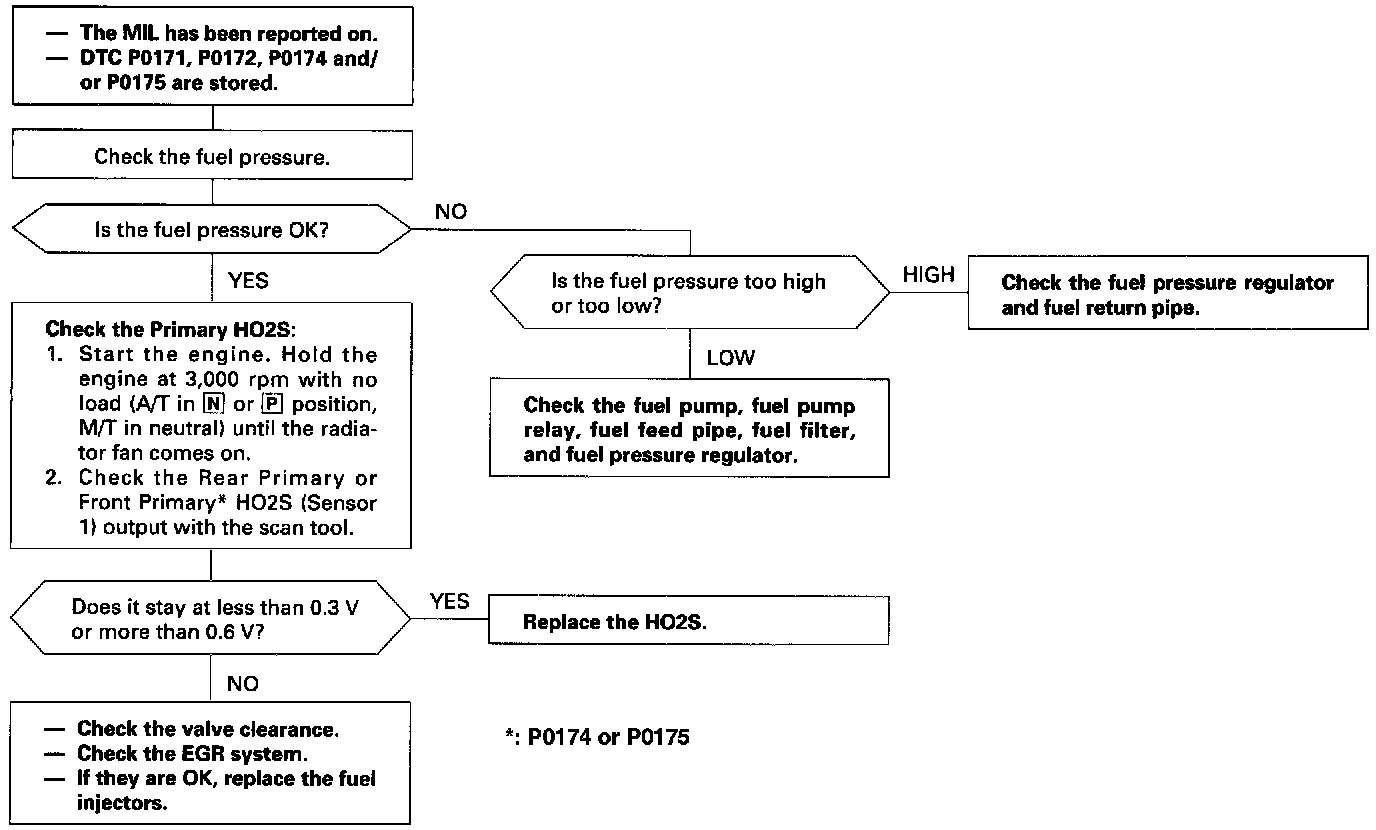 NOTE: If some of the DTCs listed below are stored at the same time as DTC P0171, P0172, P0174 and/or P0175, troubleshoot those DTCs first, then troubleshoot DTC P0171, P0172, P0174 and/or P0175.