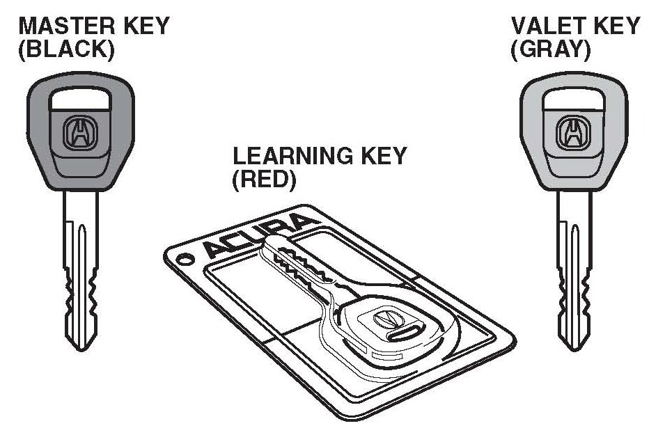 The vehicle comes with two master keys (black grip), one valet key (gray grip), and one learning key (red grip).