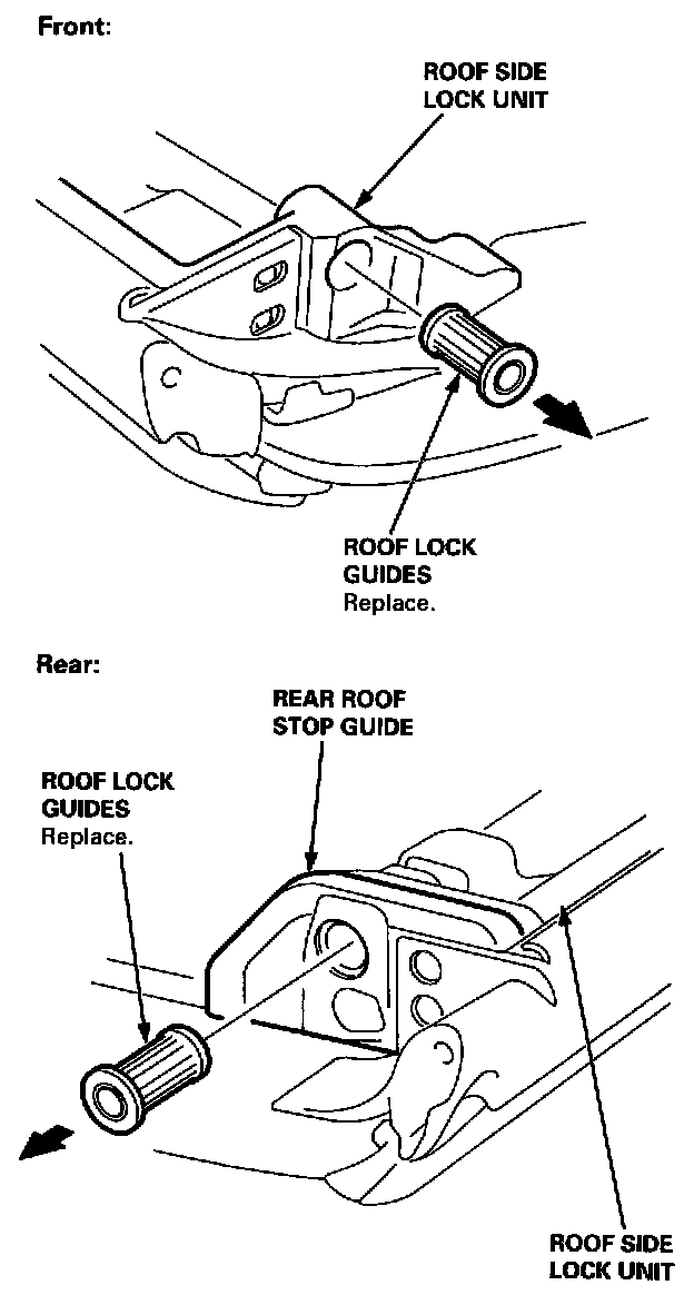 4. Clean the roof lock guide installing portion of the roof side lock unit and rear roof stop guide with a sponge dampened in alcohol.