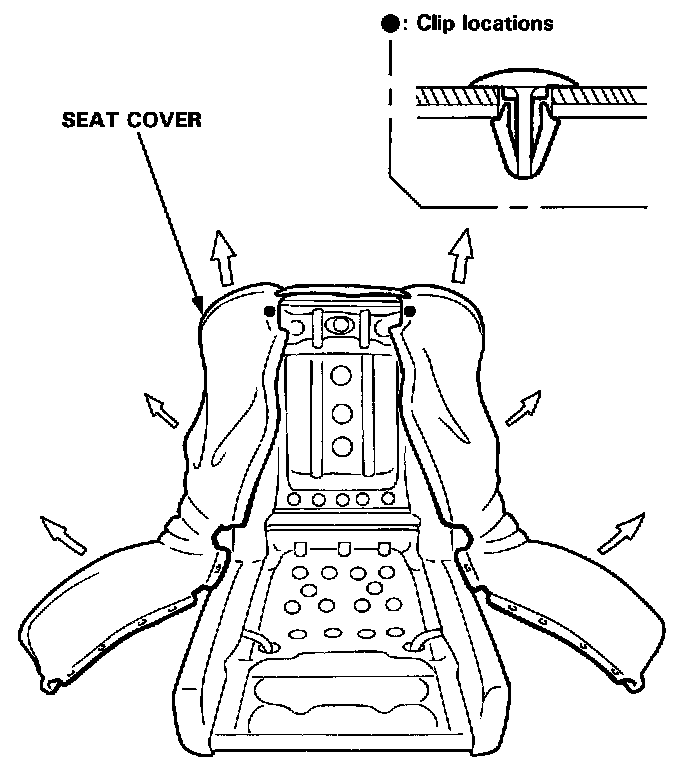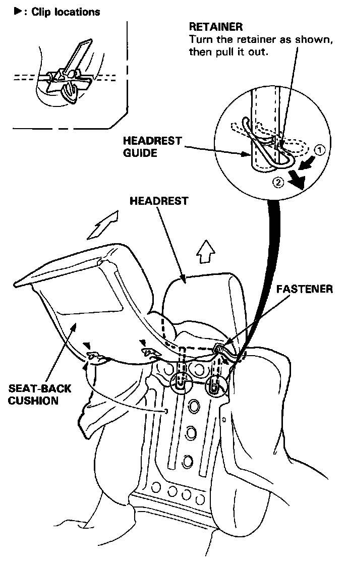 6. Detach the clips from the seat-back, then pull the seat-back cushion up as shown. Remove the retainers, then remove the headrest by pulling it up. Remove the fastener on the left side.