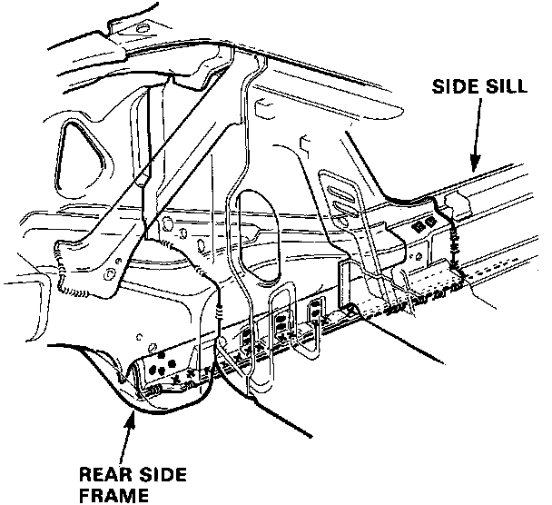 - Remove the MIG/plug welds and fillet weld in the joint section of the rear side frame and side sill using a 15 mm (5/8") spot cutter (hole saw type) and rotary cutter on each side.