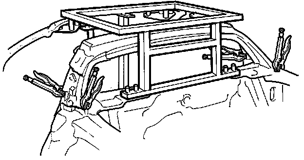 - Clamp the center inner pillar and rear roof rail and install the roof panel positioning jig as shown.