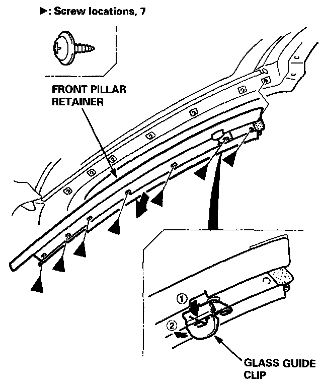 NOTE: If necessary, remove the glass guide clip from the front pillar retainer.