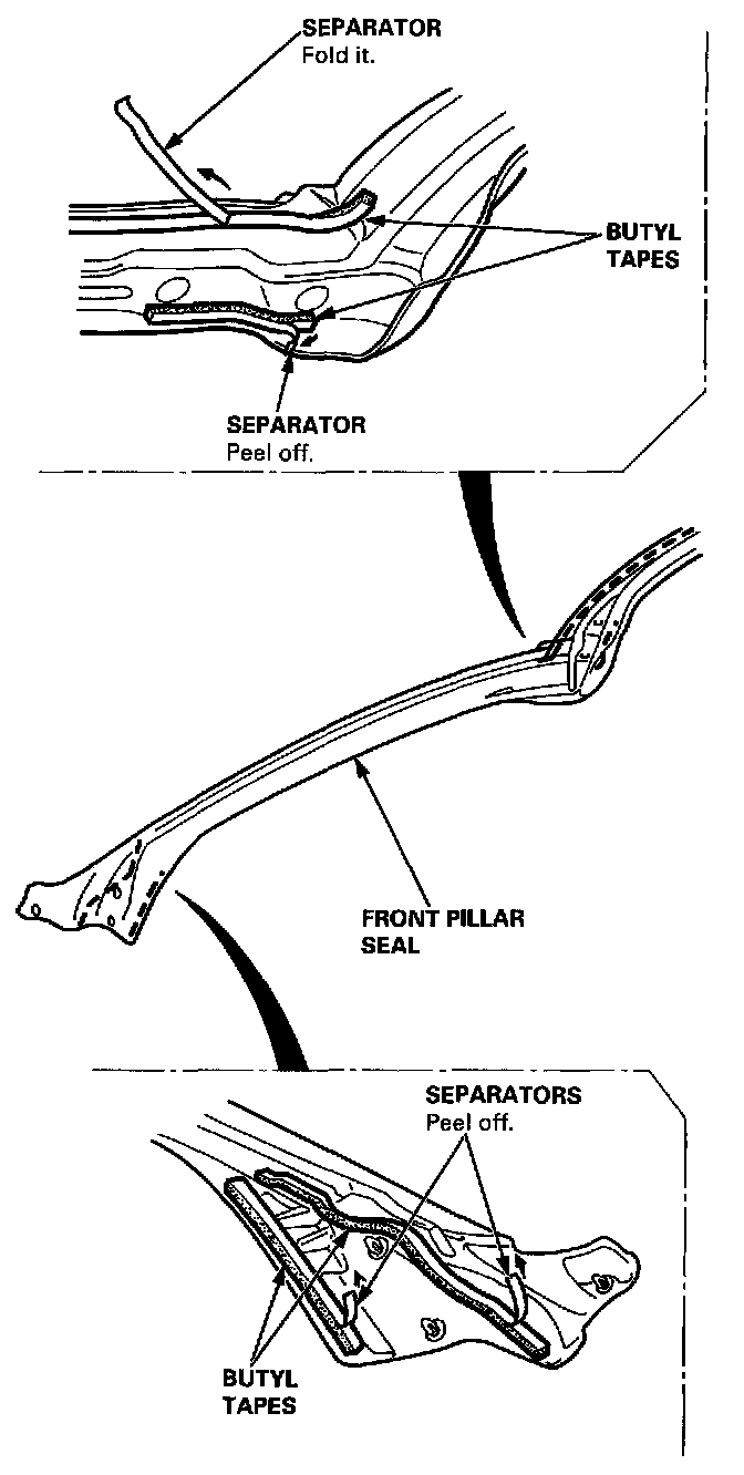 NOTE: Fold the separator of the butyl tape at the roof portion of the front pillar seal.