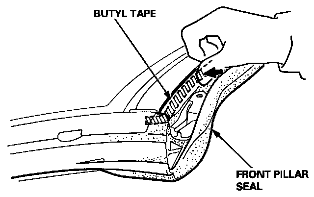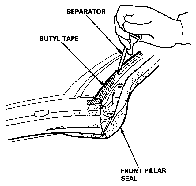 18. Carefully pull the separator away from the butyl tape at the roof portion of the front pillar seal.