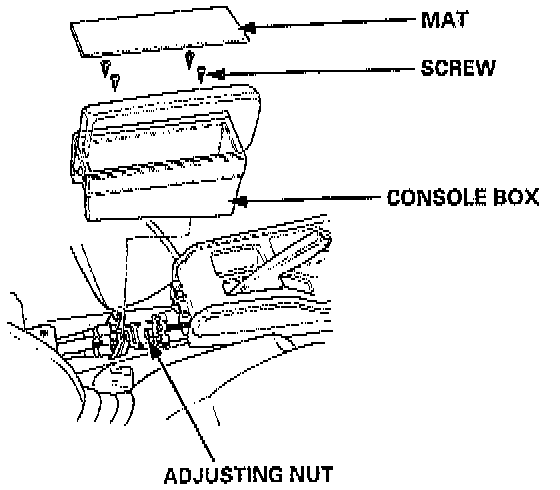NOTE: After rear brake caliper servicing, loosen the parking brake adjusting nut, start the engine, and depress the brake pedal several times to set the self-adjusting brakes before adjusting the parking brake.1. Remove the console mat, the four screws and the console box.